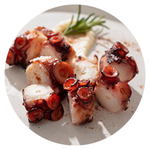 Sliced octopus cooked at a slow temperature, accompanied by potatoes, tomatoes, grilled onions, and pickled cucumbers tossed in a slightly acidic and aromatic raspberry vinaigrette.