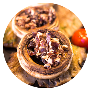 A robust portobello mushroom stuffed with a sautéed mix of spinach, garlic, and wild mushrooms, tossed with truffle oil, topped with grated Parmesan cheese, and baked to perfection.